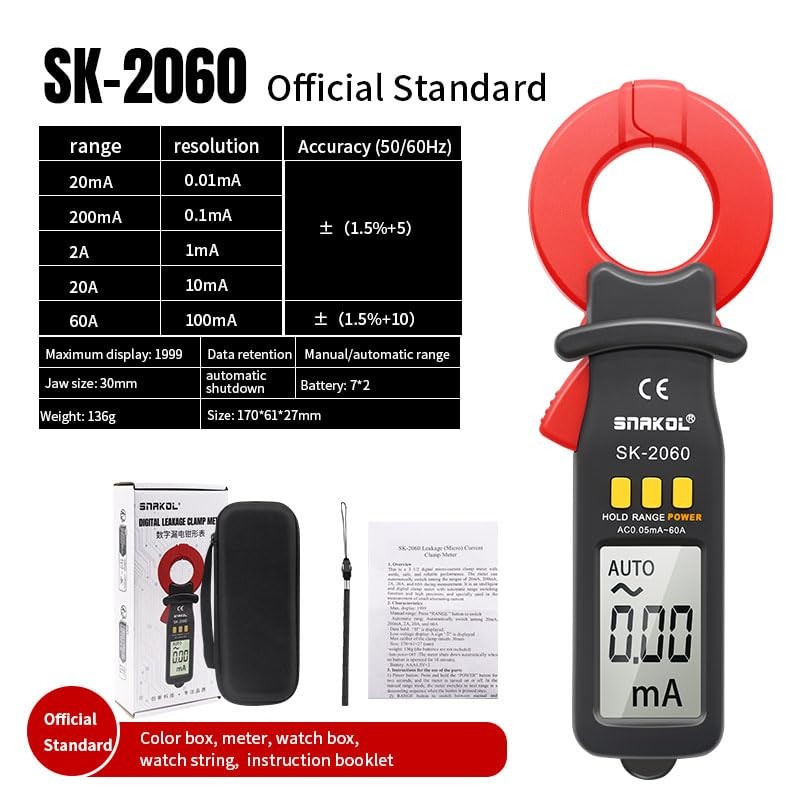 SNAKOL Digital AC Leakage Clamp Meter 0.01mA Resolution ACA MAX 60A 1999 Counts Auto Range Data Hold Ammeter Clampmeter Amperimetro Amperemetre Professional Micro Current Tester