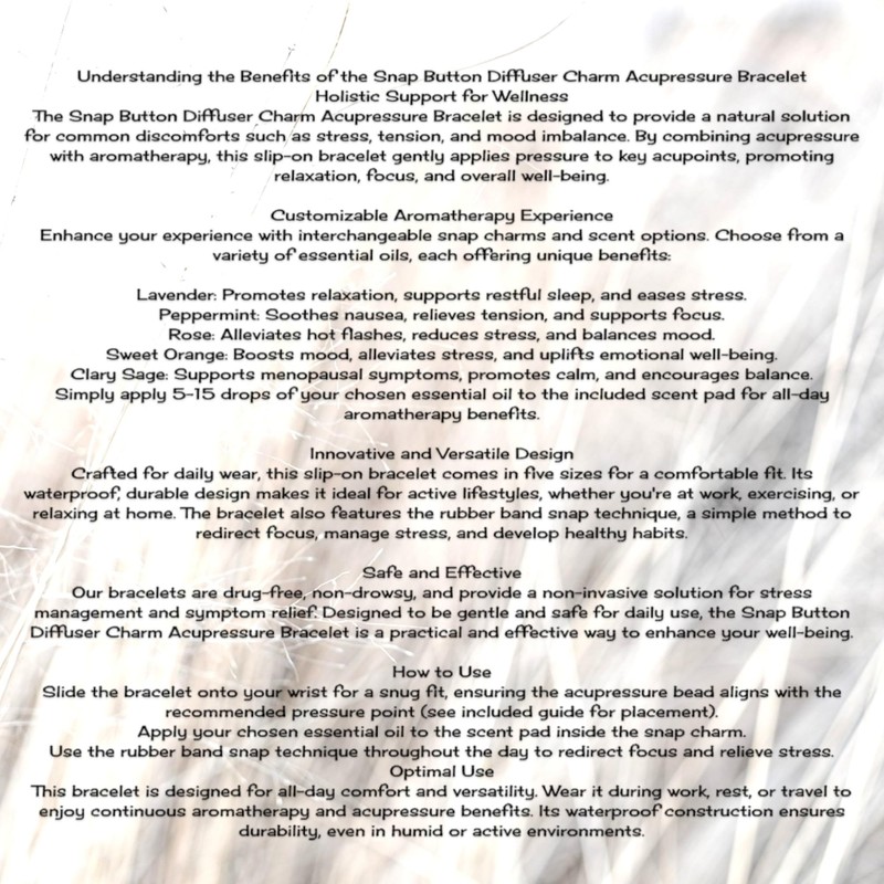 - Aromatherapy Meets Acupressure Wellness Enhance your well-being with this handmade Snap Button Diffuser Bracelet, combining acupressure and essential oils for stress relief, improved mood, and relaxation.