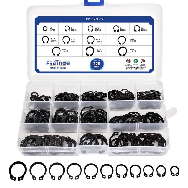 Snap Ring for Axles, Circlip, C-Shaped Retaining Ring, External Circlip Retaining Ring, C-Clip, Metal, Ring, General Purpose, DIY Work, Fixing Work, Replacement, Repair, 11 Sizes, 220 Pieces