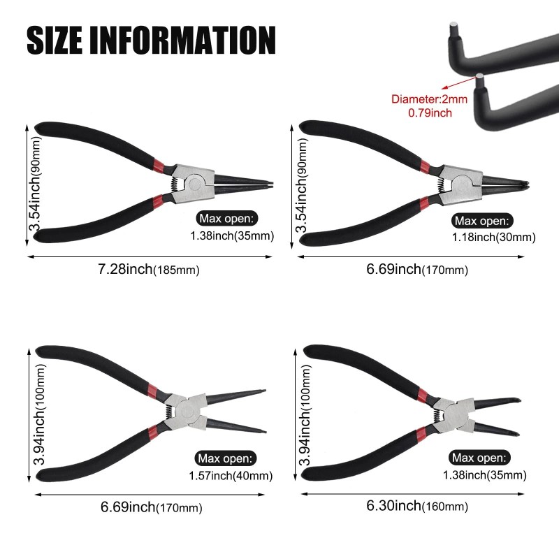 • 【Basic Size of Pliers】- Snap ring pliers is 7 inch, the tip diameter is 15 mm, the straight tip pliers open range is 0-35 mm, while the bent tip pliers open range is 0-30 mm.