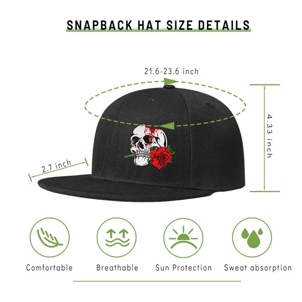 Snapback Hats for Men Cool Flat Bill Hats Skull Skateboards Hat Flat Brim Hats for Boy Snap Back Black Hat with Skull and Rose Adjustable Men's Horror Devil Baseball Cap