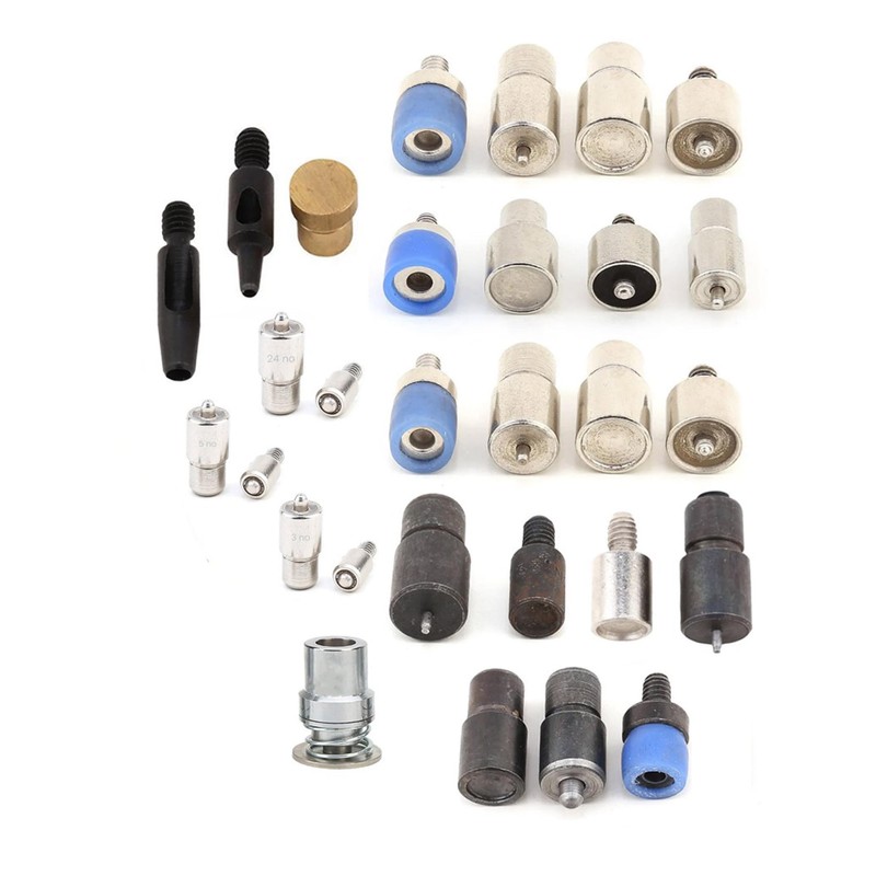 - [Snap Button Dies] 1 set of die for 10 mm 'S' spring press fasteners type VT2 (includes 4 pieces) 1 set of die for 12,5 mm 'S' spring press fasteners type T54 (includes 4 pieces) 1 set of die for 15 mm 'S' spring press fasteners type Alfa (includes 4 pieces) 1 set of 9.5mm Perforated prong snap button fastener button tool/die (includes 2 pieces)