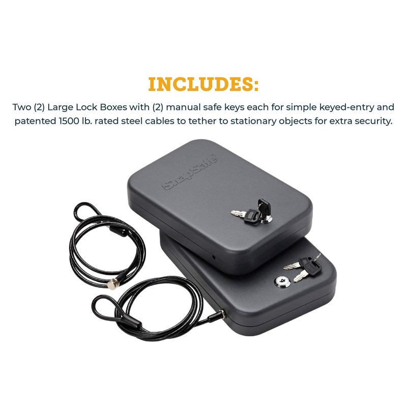 SnapSafe Portable Lock Box for Guns and Valuables, 2 Pack - Includes 2 Lock Boxes (Keyed Alike), 4 Keys and Patented Security Cable - an Ideal Car Gun Safe - Large, Black, 9.5 x 6.5 x 1.75 Inches