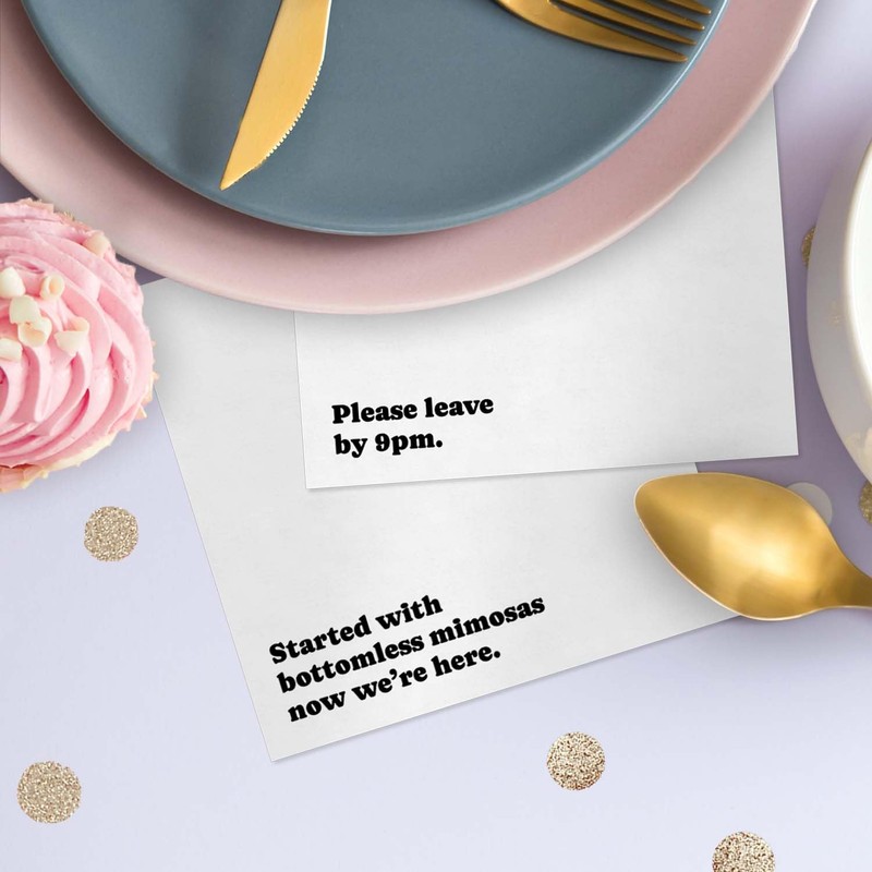 - Modern Designs: This simple black and white napkin set features 4 funny party phrases. There are 12 napkins of each design. Printed on one folded side of high quality 3-ply napkins.