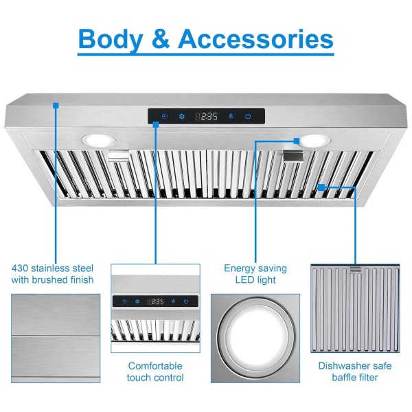 【Stainless Steel Range Hood】Hood body is made of 430 premium stainless steel with brushed finishing, can be cleaned easily after cooking each time.This range hood comes with two stainless steel baffle filters, endurable and elegant, ideal for most kitchens. Baffle filter is dishwasher-safe, save your cleaning time.