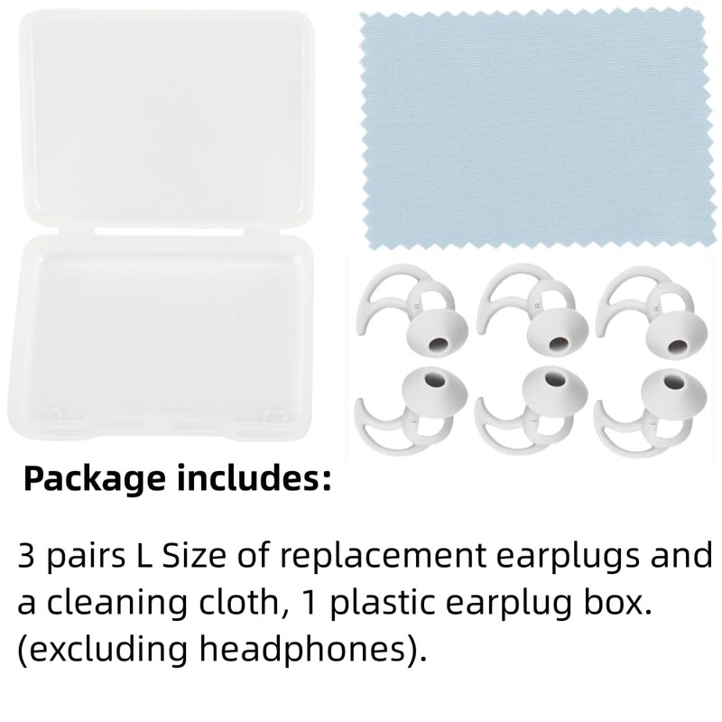 - Package includes: 3 pairs replacement ear tips and a cleaning cloth, 1 plastic earplug box (excluding headphones).