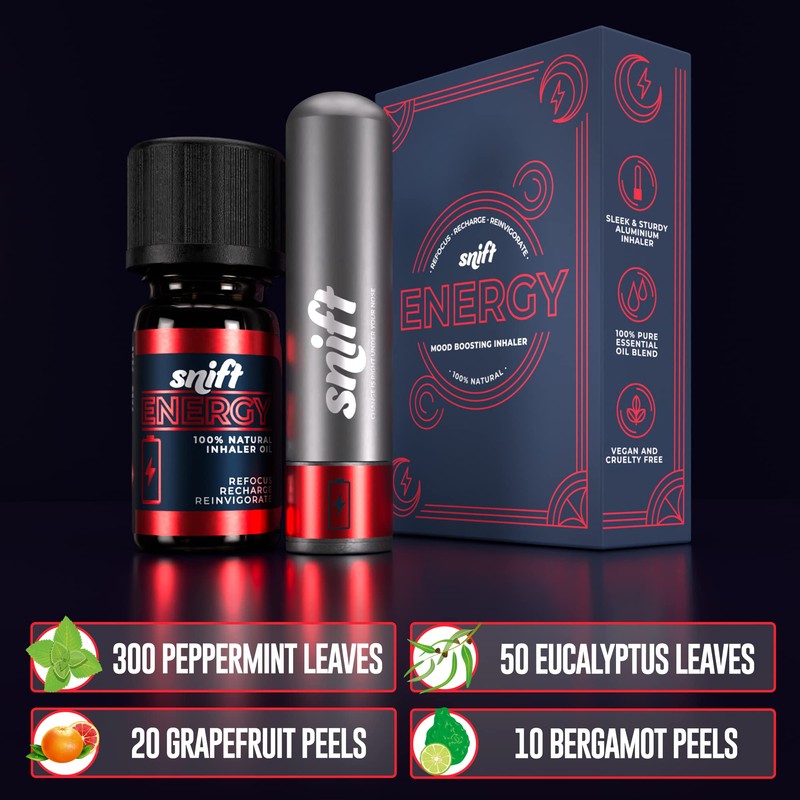 Snift Energy Nasal Inhaler | Aluminium, Refillable | Lasts 1 Year+, Pure Essential Oils (5ml) | Peppermint, Eucalyptus, Grapefruit, Bergamot
