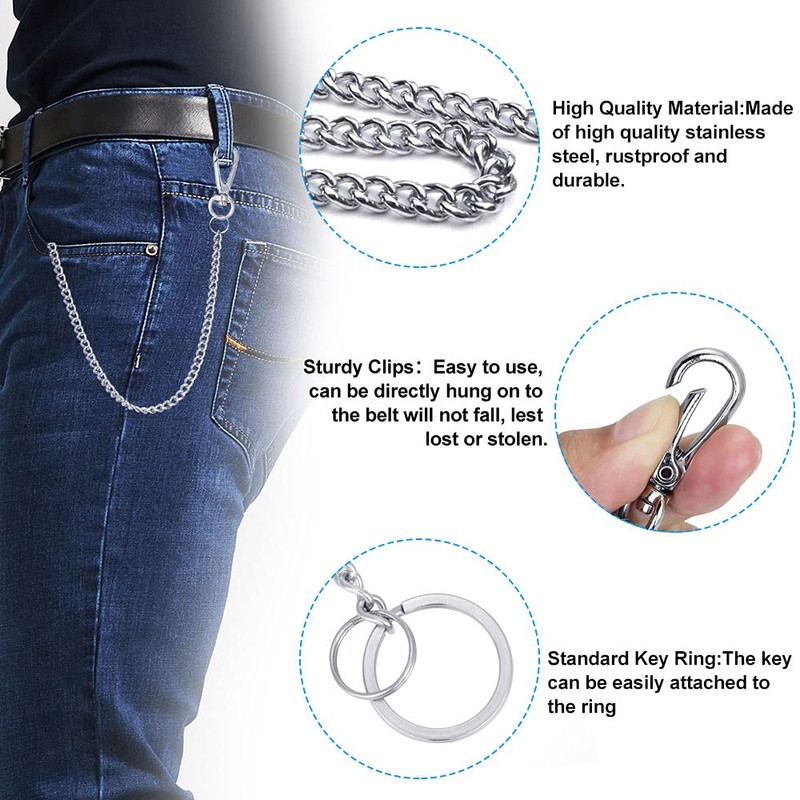 • 【Simple Silver Appearance】: The pants chain has a simple silver appearance, classic and fashionable. Whether it is used for daily key hanging or as a trendy accessory, it can be easily matched with various styles to meet different usage needs