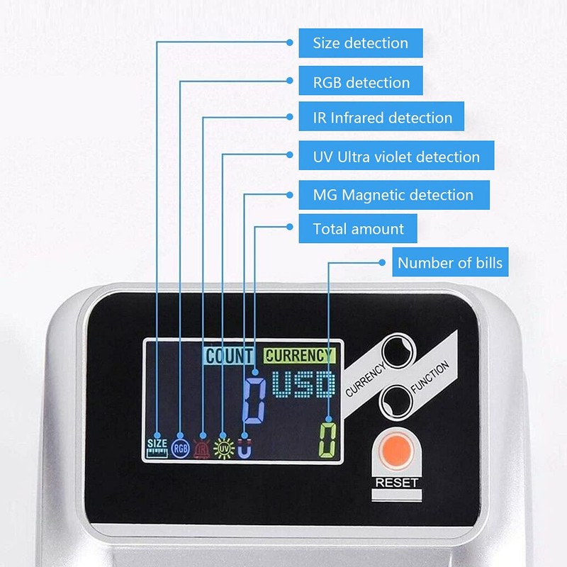 - 【Protection】Counterfeit Detector protects every one of your business with our state-of-the-art 5 analysis.Use advanced detection methods to defend against potential counterfeit banknotes.Does not take up much space,is 3x faster,and takes less than 1 second per bill.Note:Bills are calculated one by one,only in USD.