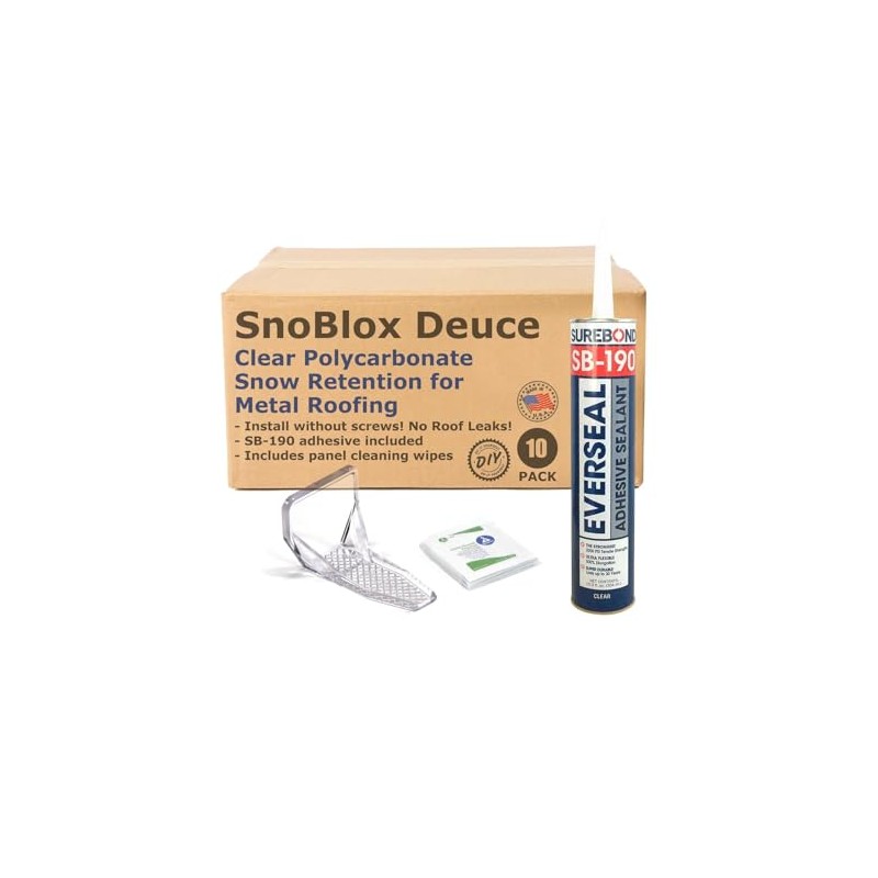 SnoBlox Deuce Snow Guard – 10 Pack for Metal Roofs | Clear Polycarbonate Roof Snow Retention System | Choose Adhesive No-Drill Kit or Screw-On Kit | Made in USA (DEUCE-10PK-ADH)