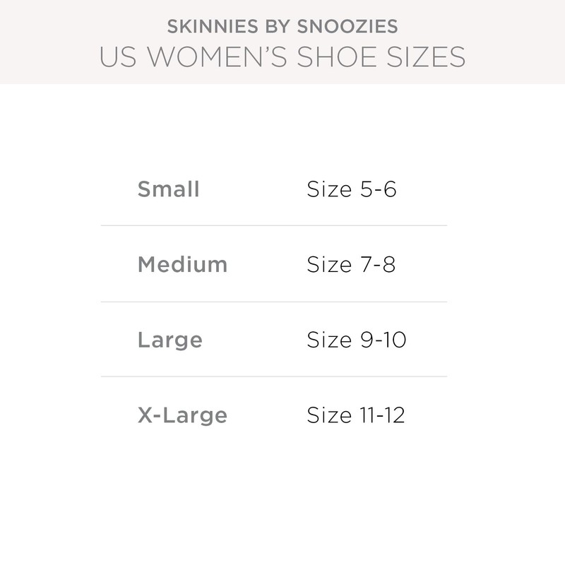 - Snoozies slipper socks Women's Size Conversion: Small (Women's US Shoe Size 5-6), Medium (7-8), Large (9-10), and X-Large (11-12)