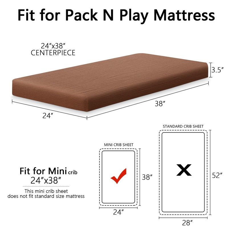 - ๐ ๐ข๐ญ ๐๐จ๐ฌ๐ญ ๐๐๐๐ค ๐๐ง๐ ๐๐ฅ๐๐ฒ ๐๐๐ญ๐ญ๐ซ๐๐ฌ๐ฌ- Measuring 24" X 38" X 6", our stretchy pack-and-play cover sheets fit the most pack-and-play mattress and standard baby mini crib mattress. The fitted crib sheets are professionally sewn with soft elastic all around the edge to keep it securely in place and at the same time make changing it a quick and easy task for you.