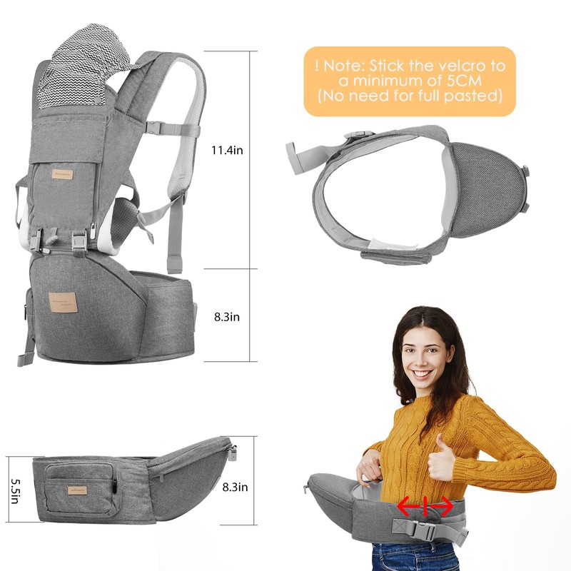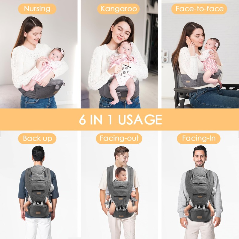 SNOOZYNEST Baby Carrier Newborn to Toddler with Hip Seat, Soft 6-in-1 Ergonomic All Positions Infant Carrier 7-33 Ib with Hood for All Seasion Use for Dad and Mom Grey