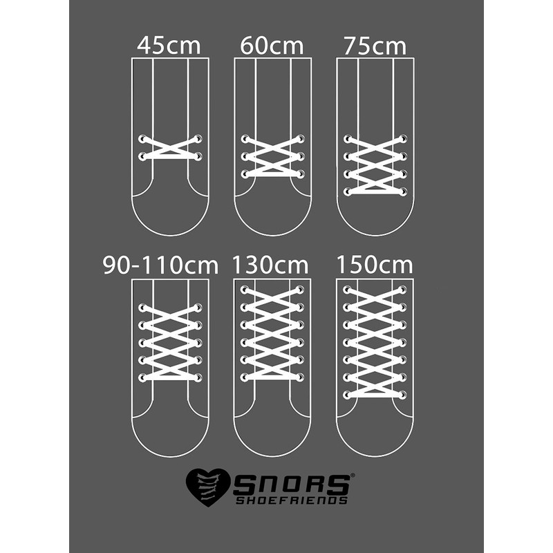 - Waxed round laces from SNORS are available in the following lengths: 45 cm, 60 cm, 75 cm, 90 cm, 110 cm, 130 cm and 150 cm. The round laces are not elastic. So they do not change when tightened.