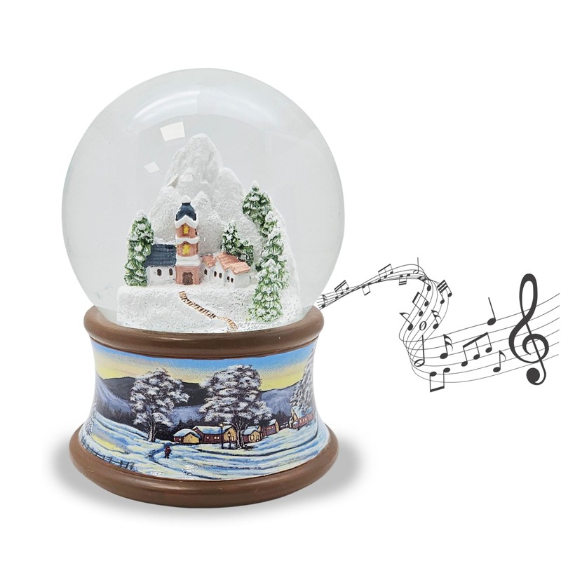 Snow Globe Christmas Music Box | Mountain Village Winter Mountains | Base Winter Landscape | Height: 14 cm Width 10 cm | 20286 (Bergdorf Brown Base)