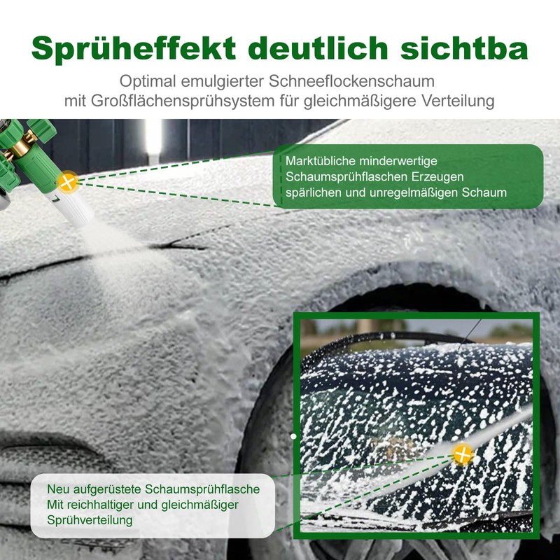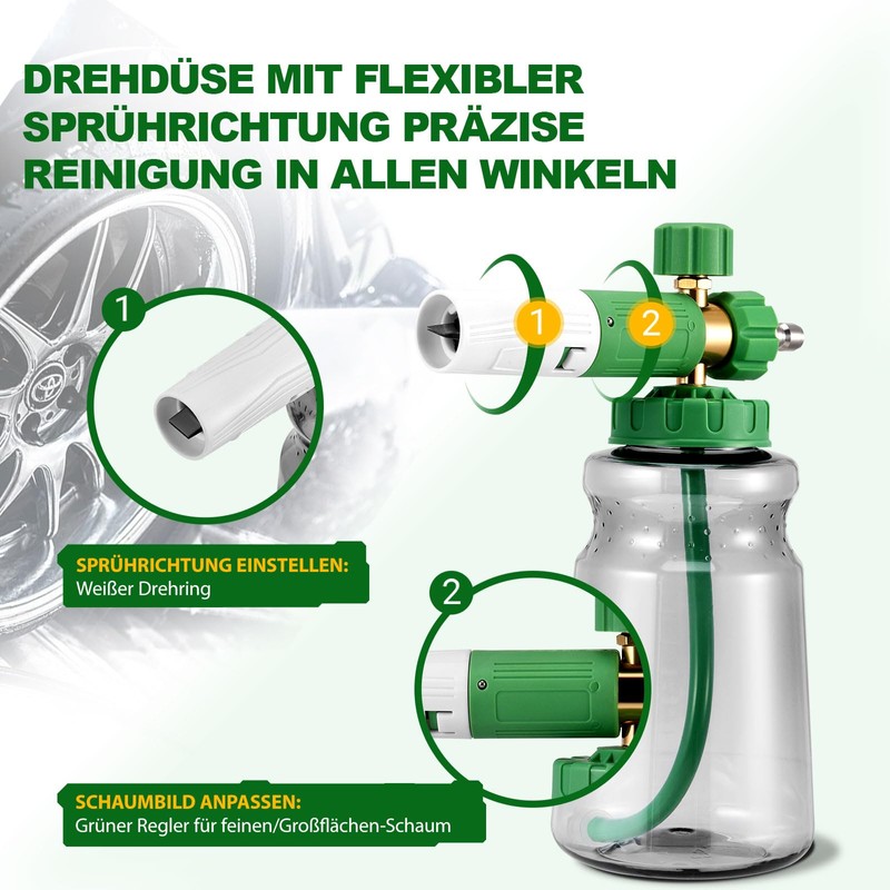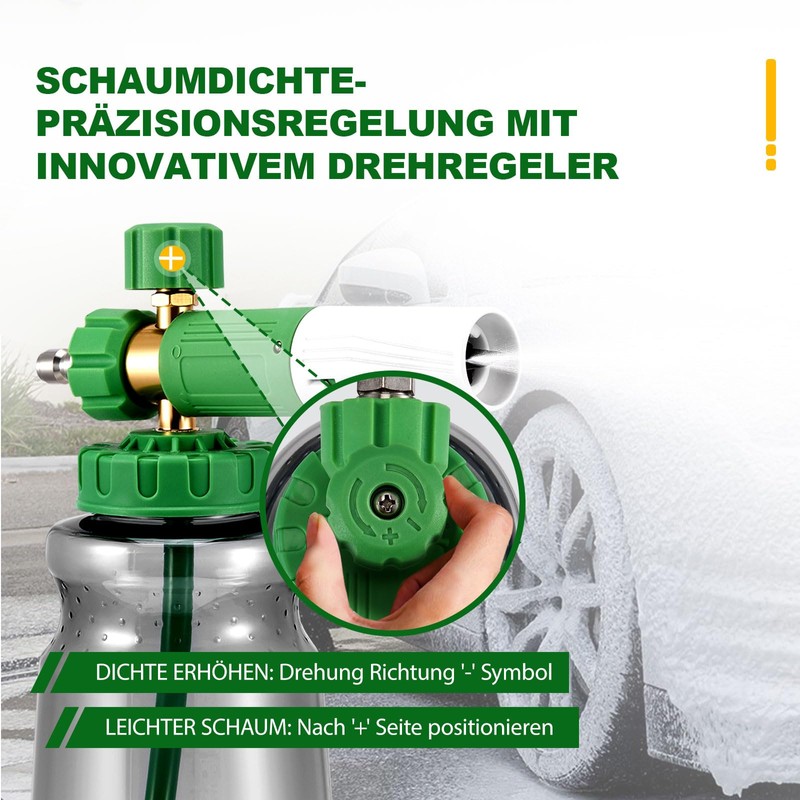• Adjustability: the snow foam gun can be adjusted according to your wishes both in fan angle and with a 360° horizontal and vertical rotation. The upper foam quantity regulator allows you to fine tune the foam consistency: