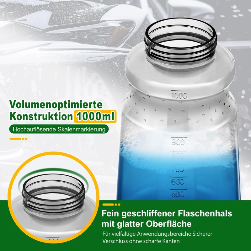 • UPGRADED DESIGN The wide neck of this foam spray cannon makes filling easier and prevents overflow. It is easy to clean and leaves no detergent residue. The durable compounds and tough, corrosion-resistant bottle guarantee long-lasting and reliable performance. With a high capacity of 1 litre, you can wash 2-3 cars.