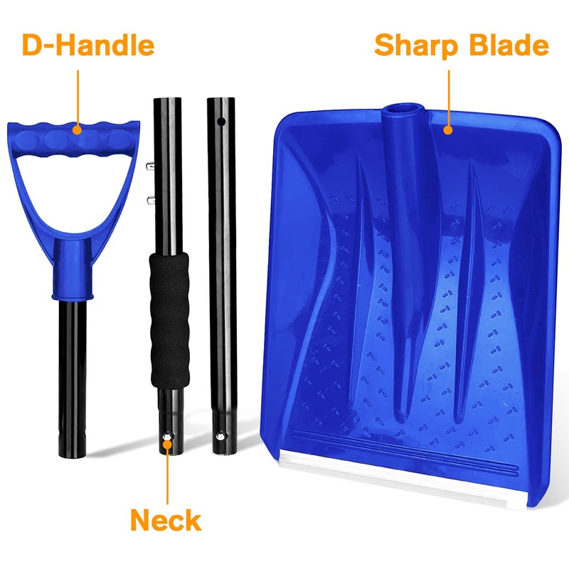 - 【UPGRADED & EXTENDED】The snow shovel is composed of a shovel head and three handles, which can be assembled in two different lengths to meet your different needs. The assembled short length is 33 inches, and the assembled length is 45 inches.Easy to assemble and disassemble, it won't take up too much space when disassembled and placed in the car. It weighs only 1.45 pounds and is very lightweight to use.