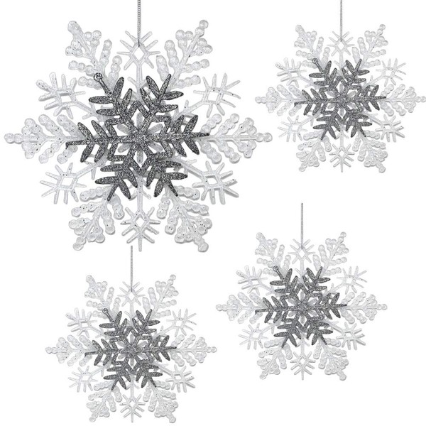 - GLITTERED SNOWFLAKES. This is a set of 4 white and silver snow flake ornaments. Each Snowflake is approximately 8 ½”(inches) in diameter. These are a beautiful addition to any colored Christmas tree.