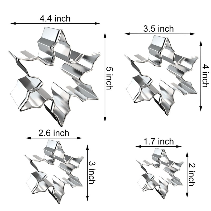 - The snowflake cookie cutter set includes four different sizes: 5", 4", 3", and 2". Each cutter has a 1" deep cut and is suitable for cutting dough, fondant or craft clay. Make snowflake cookies for a party or winter event.