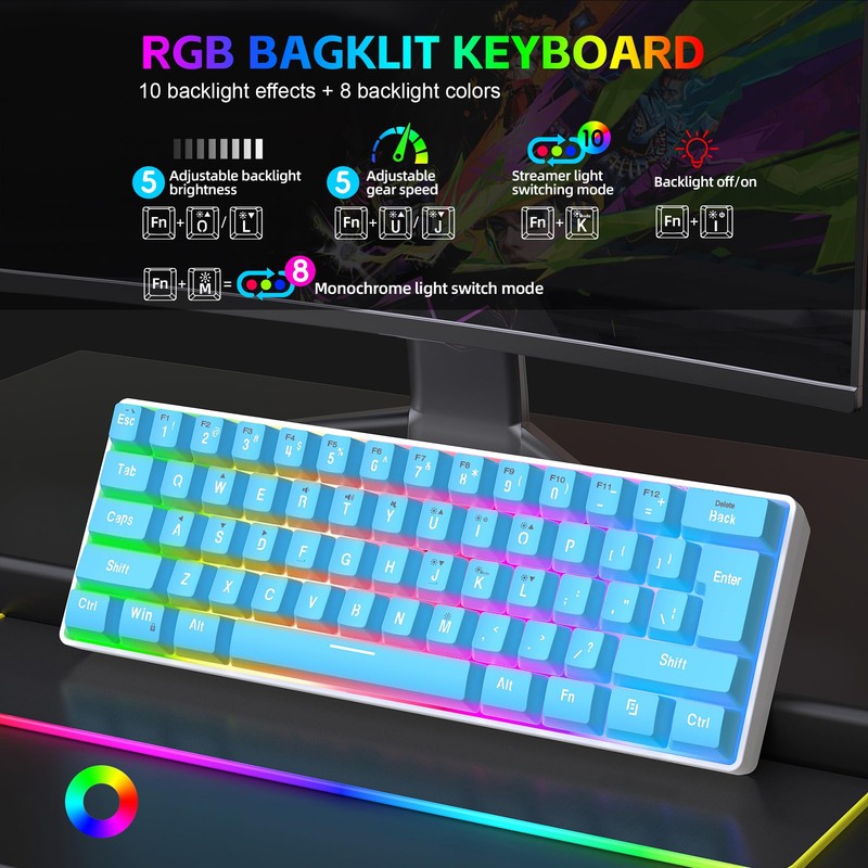 - Cool RGB Backlit Effect — The 60% rgb keyboard include 10 backlight effects and 8 backlight color switching. Different RGB setting enriches your typing time. Lighting speed and level can also be adjusted according to your need.Now,Key cap upgraded to double - color injection molding, white characters