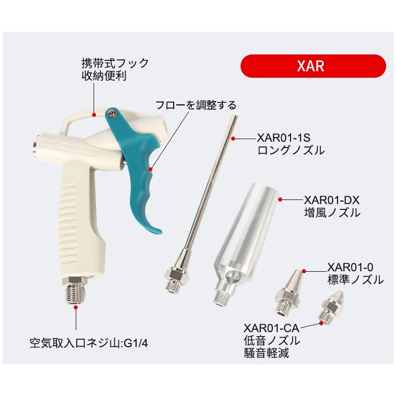 SNS XAR01-0/1S/DX/CA Air Duster, Air Blow Gun, 2-Way Air Leak Prevention, Standard Nozzle for Flow Adjustment, Bass Nozzle, Long Nozzle, Set of 4 Air Enhancement Nozzles