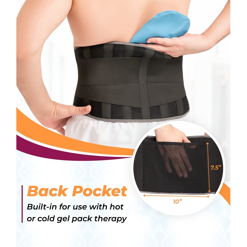 The key feature of our back support brace is it comes with a built-in back pocket for use with hot or cold gel pack therapy. Heat therapy improves the blood flow, relaxes and soothes muscles, and heals damaged tissues. Cold therapy reduces blood flow to a particular area and help reduces inflammation, swelling, and reduce nerve activity to relieve pain.