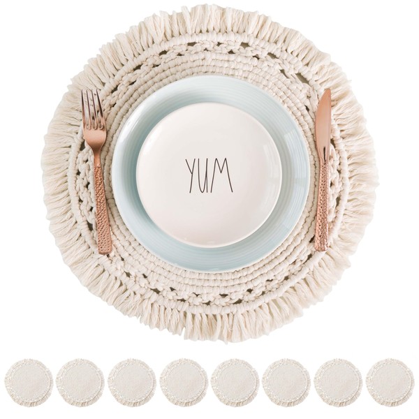 SnugLife Macrame Placemats Set of 8 - Handmade Cotton Woven Boho Placemats - Modern Farmhouse Fringe Placemats for Dining Table, Kitchen, Bohemian Wedding Décor, Rustic Natural Off White, 16"