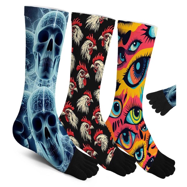 SnuYucto Funny Toe Socks for Men and Women, Novelty 5 Toe Design with Skull, Eyes and Chicken Pattern for Adults Gifts, Unisex Mid-Calf Sports for Running, Size 9-13, 3 Pairs