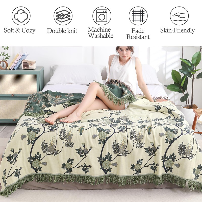 Snycler Boho Throw Blanket for Bed - 100% Cotton Ultra Soft Rustic Quilt Green Hummingbird Printed Farmhouse Decor Bed Blankets,60"×80" All Season Rustic Throw for Sofa Couch Chair