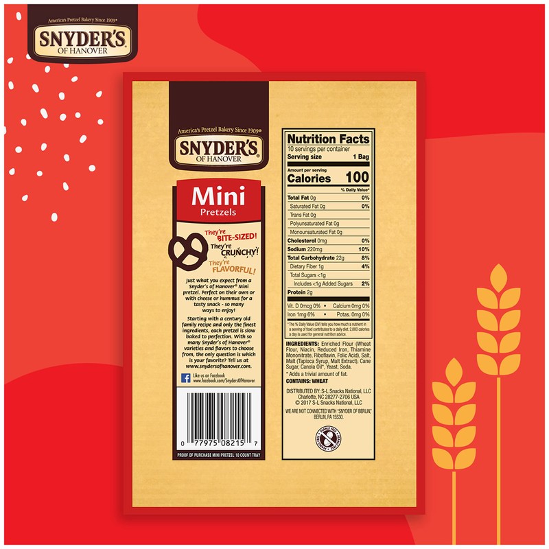 Snyder's of Hanover 100 Calorie Mini Pretzels give you that delicious crunch for a perfectly sized snack - only 100 calories per snack pack but full of flavor! Our Mini Pretzels offer all the naturally delicious flavor of traditional pretzels in a crunchy, bite-size snack. Packaged as individual packs of pretzels, these mini pretzels are the perfect lunch snack, school snack (made in a facility that does not process peanuts), or on-the-go snack. Stock up your office or pantry with this value pack! Snyder's of Hanover has been America's Pretzel Bakery since 1909 and our pretzels give you that delicious crunch for the perfect snack! Non-GMO project verified and made in a facility that does not process peanuts, Snyder's of Hanover pretzels are made from wholesome ingredients, kneaded, and oven-baked to seal in all the flavor. Snyder's of Hanover pretzels have been shared across tables, across generations and across the country, making us America's favorite pretzel brand.