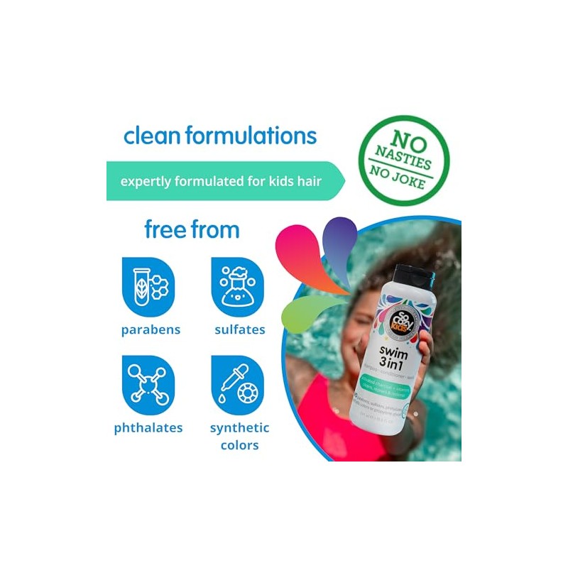 SO COZY SoCozy Kids Swim 3-in-1 Shampoo, Conditioner & Body Wash - 3-in-1 Combo Pool Shampoo & Conditioner for Swimmers - Salt & Chlorine Removing Activated Charcoal for Toddler & Kids Hair After Swimming