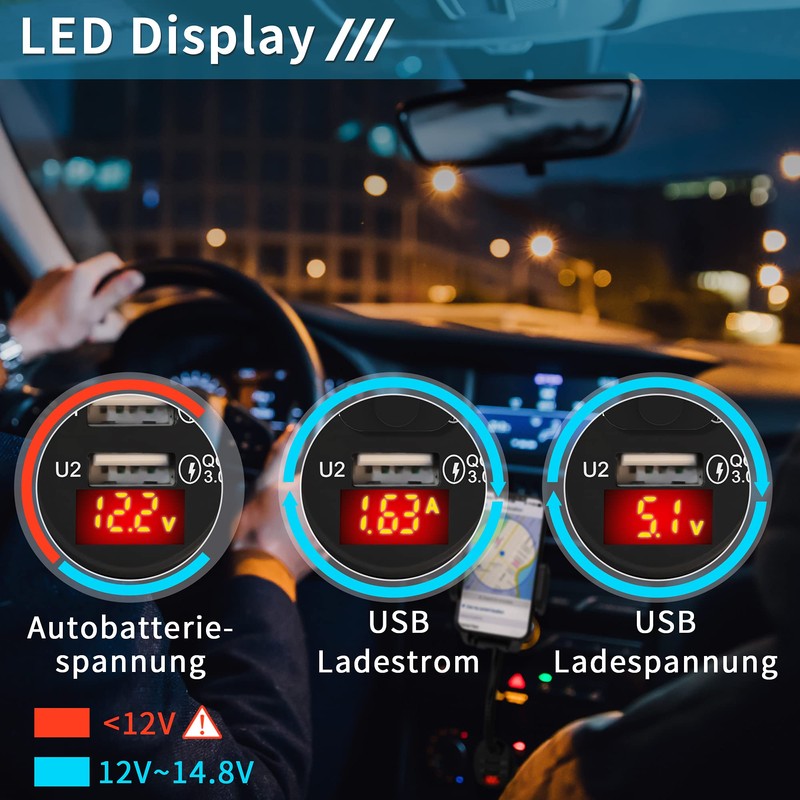 - Lädt Ihre USB-Geräte und warnt vor zu niedriger Autobatterie-Spannung: Das übersichtliche LED-Display zeigt Ihnen abwechselnd und aktuell die Spannung Ihrer Autobatterie, die Ladespannung und den Ladestrom der beiden USB Anschlüsse an. So erkennen Sie auch sofort, wenn die Bord-Spannung zu niedrig ist. Ersparen Sie sich also böse Überraschungen.