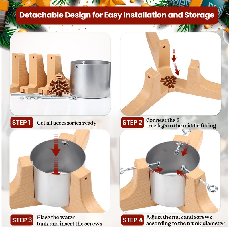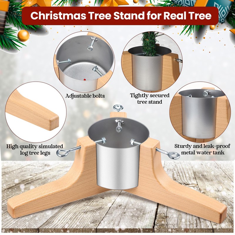 - Christmas Tree Stand Set: this package includes 1 live Christmas tree stand, including 1 clip, 1 water basket, 3 stand legs, 3 bolts and 3 nuts; With these complete practical accessories with rustic wood design at your disposal, setting up your tree becomes a breeze and enhancing the festive spirit in your home
