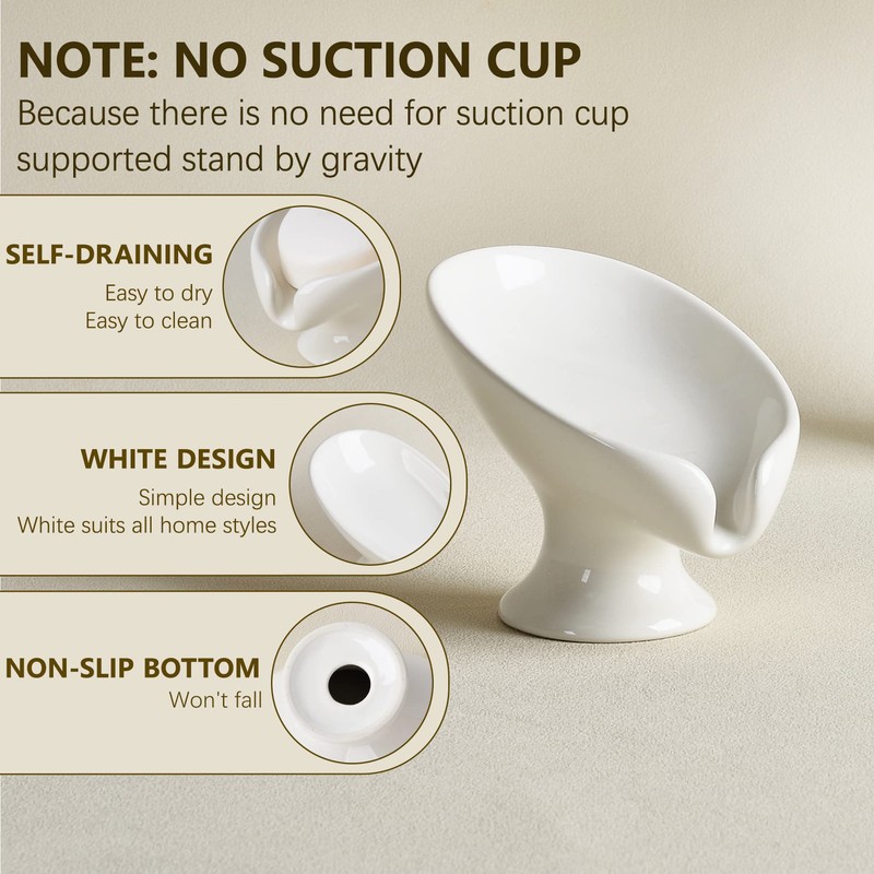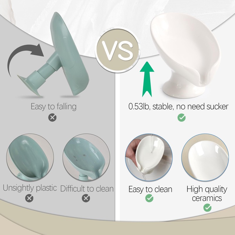 - Self-Draining Design: This ceramic soap dish features a 45° angled design inspired by lotus leaves; promotes quick drainage to keep your bar soap dry and reduce waste; the soap holder stays stable by its own weight, no need for suction cups