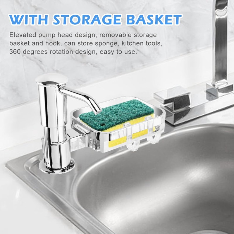 【WITH STORAGE BASKET】Elevated pump head design with detachable storage basket and hook to store sponges, brushes, rags, wire sponge and other kitchen tools, 360 rotatable design for easy use, keep countertops clean and tidy.