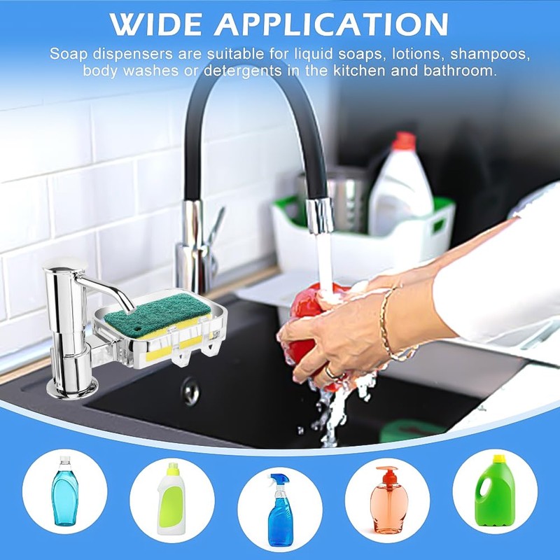 • 【WITH STORAGE BASKET】Elevated pump head design with detachable storage basket and hook to store sponges, brushes, rags, wire sponge and other kitchen tools, 360 rotatable design for easy use, keep countertops clean and tidy.