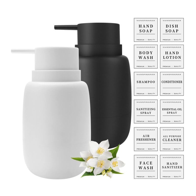 - Package Includes - 2 x extra thick plastic soap dispenser with pump, 12 x waterproof labels. Elegant bottle design with minimalist stickers, perfect for hotels, offices, shops or restaurants. If you have any questions please feel free to contact us, we will provide you with satisfactory service.