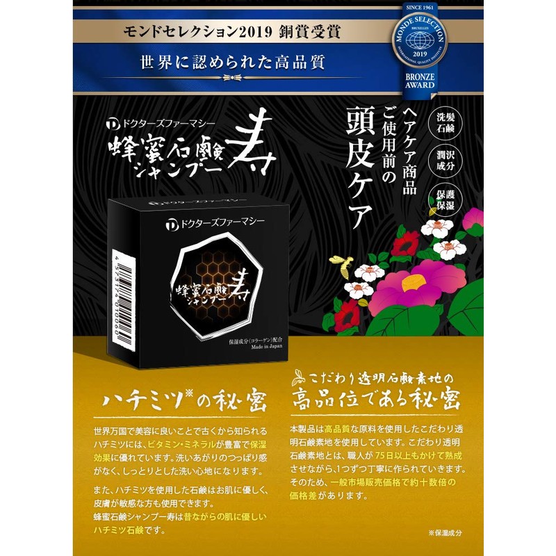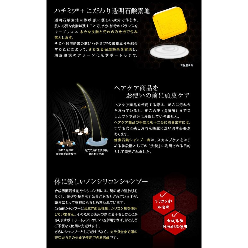 Honey Soap Shampoo Life, a soap shampoo made with carefully selected clear soap base and natural honey (moisturizing ingredient). Natural honey formula moisturizes scalp and hair. Also, it does not use artificial synthetic surfactants or silicone agents normally used in shampoo, so it is gentle on the scalp and hair. It can also be used for hair as well as whole body. Honey Soap Shampoo Sushi Honey Soap Shampoo Sushi uses carefully selected transparent soap material. Made by artisans and aged for more than 75 days. Skin-friendly and recommended for sensitive skin.