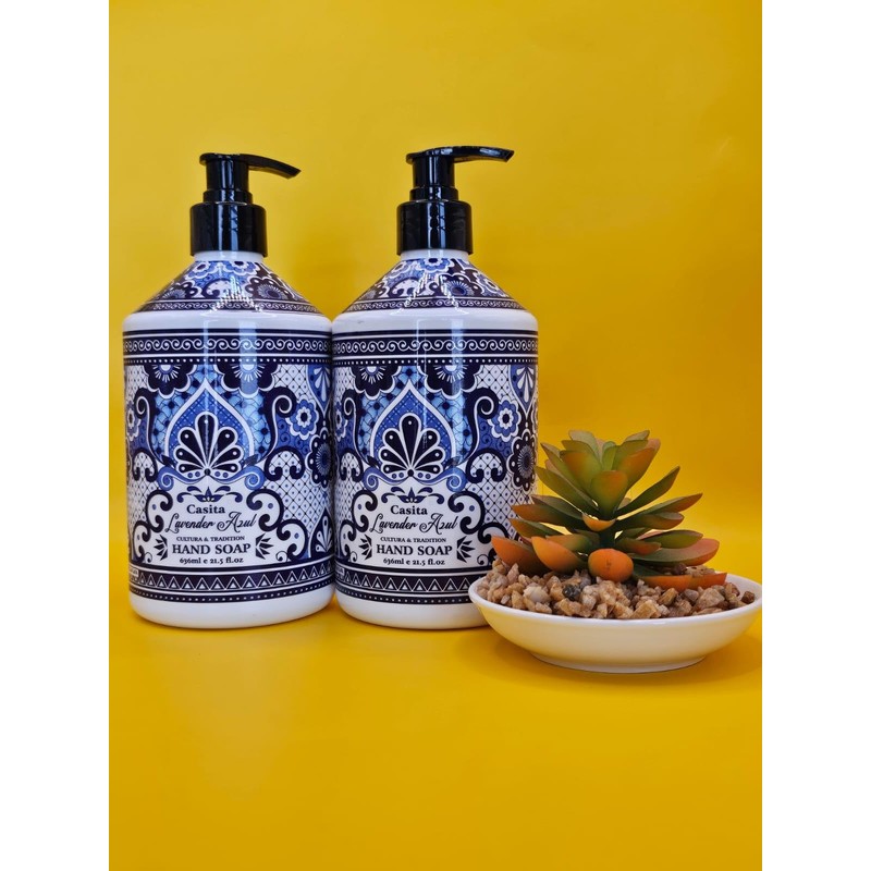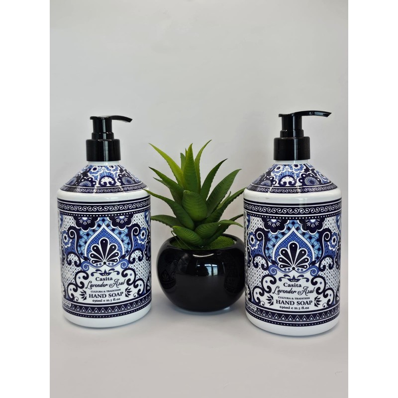 Indulge in the luxurious fragrance of lavender with the Soap Tiles Lavender Azul Liquid Hand Soap. This decorative twin pack features two 21.5 fl oz pump bottles adorned with intricate blue and white designs inspired by traditional Spanish culture. The rich lather gently cleanses your hands, leaving them feeling refreshed and lightly scented with the soothing aroma of lavender. Elevate your bathroom decor with these beautifully crafted hand soap bottles that blend elegance and functionality seamlessly. Treat yourself to a touch of indulgence with every wash.