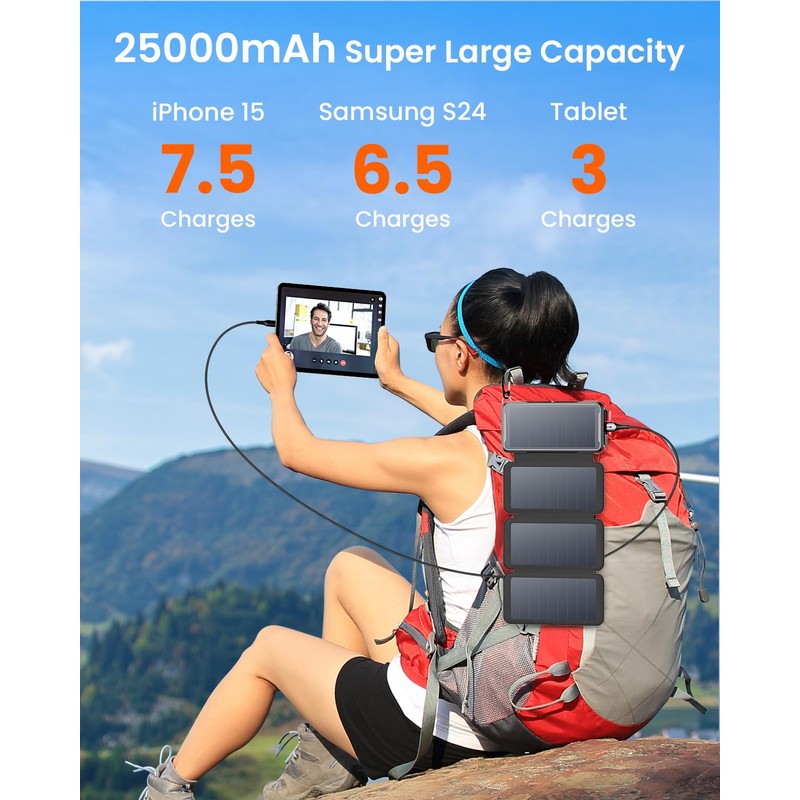 • 【Super Large Capacity】This solar charger power bank comes with 25000mAh high quality lithium polymer battery, which has 50% more cycles than other ordinary lithium batteries. A fully charged solar battery charger can charge a 3000mAh cell phone about 6-7 times or a tablet about 3-4 times