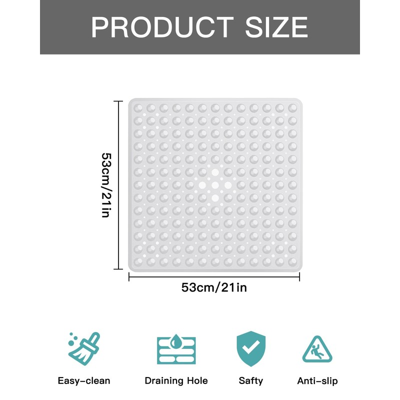 SOBEAU Non-Slip Shower Mat, 53 x 53 cm, Square Shower Mats, BPA-Free, Non-Slip Mat for the Shower with Drainage Holes for Mould and Fungus Resistance (Transparent)