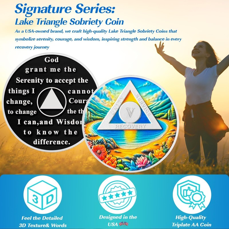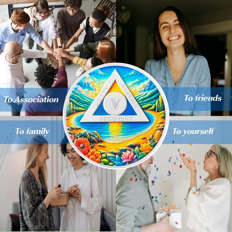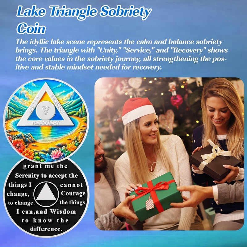 - Powerful Sobriety Design:This 5 year sobriety coin features a peaceful landscape with a lake nestled among mountains under a bright sky. This serene scene symbolizes the balance that sobriety offers. The triangle inscribed with "UNITY," "SERVICE," and "RECOVERY" reflects the core values of a sober life. This sobriety coin serves as a potent reminder to stay committed to addiction recovery, making it an ideal NA coin for anyone celebrating their sobriety journey