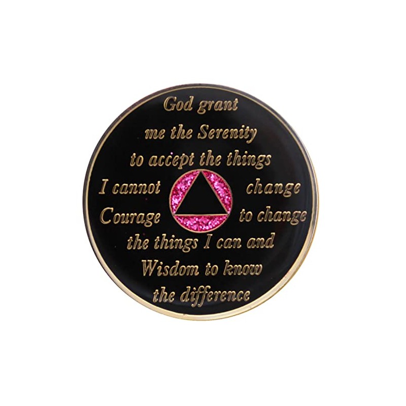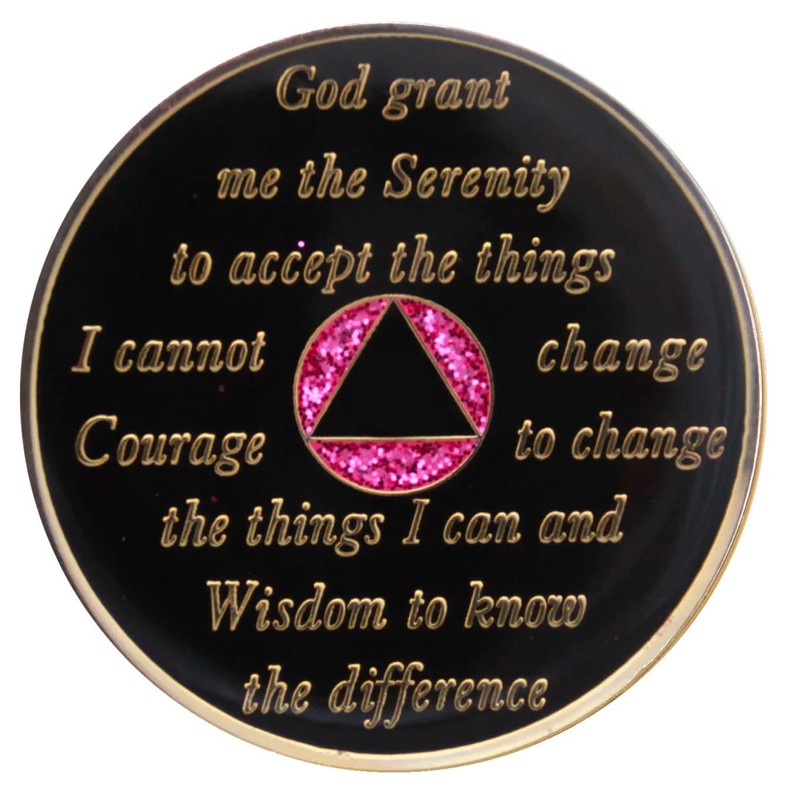 • The back of the coin shows the “AA Serenity Prayer” in embossed 14k gold-plated brass on a background of hand-painted black, surrounding a small circle and triangle AA symbol in black and pink glitter. It reads: “God, great me the serenity to accept the things I cannot change, the courage to change the things I can, and the wisdom to know the difference.”