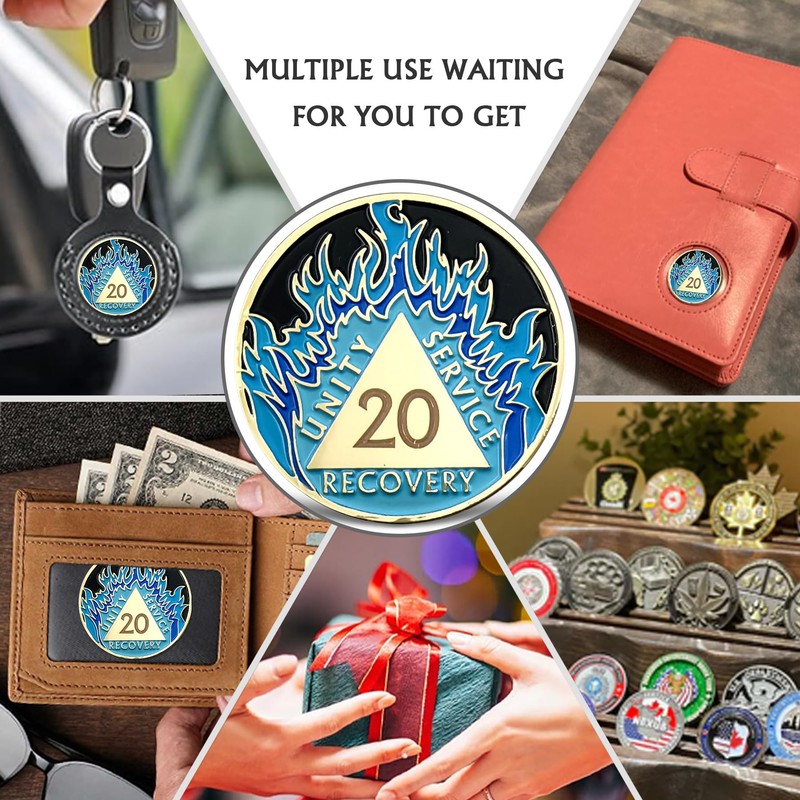 Premium Material and Intricate Design: Double sided AA Sobriety Coin is crafted from metal with high polished gold plated, nice gradient blue, black enamel. Obverse side of 20 year aa coin medallion is designed with 3D scuplted artwork: AA legacies motto: "Unity, Service, Recovery" surrounded with twisted flames, center is laser number 20, signifying 20 year sobriety length; reverse side of aa recovery medallion engraves AA Tenth Step Promise:"If tempted, we recoil from it as from a hot flame".