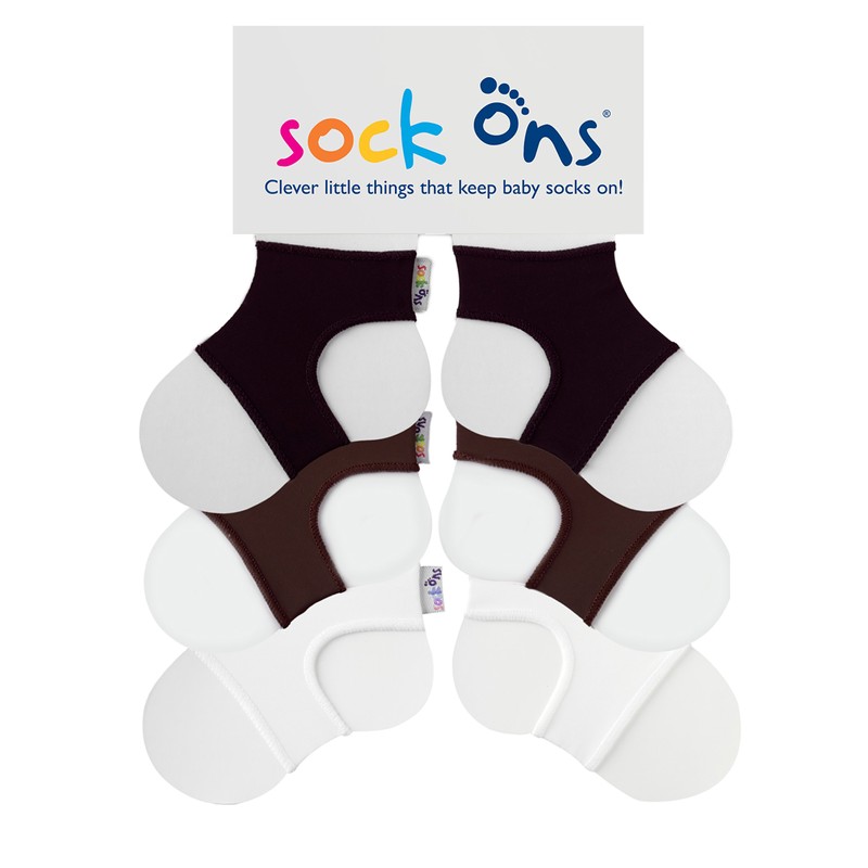 Sock Ons - Baby Sock Holder - 6-12 Months - Pack of 3 (1 x White 1 x Black 1 x Brown) - Amazing Value Pack - Amazing Value Pack - Always Put on Baby Socks!, White, black, brown