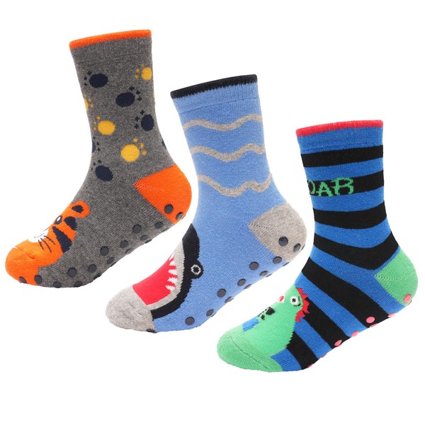 Sock Stack 3 Pairs Boys Girls Kids Slipper Socks Non Slip Super Soft Thermal Warm Winter Socks With Non-Skid Grippers for Ultimate Comfort and Safety, Dino Shark Tiger 6-8