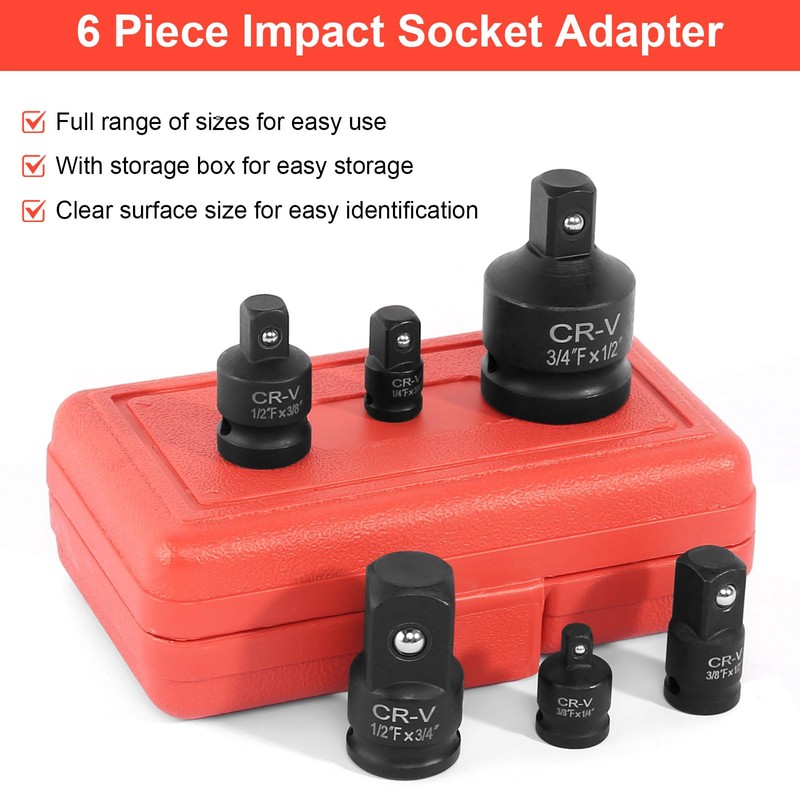 - Socket adapter set: you will receive a set of 6 sleeve adapters and a storage box. There are many different types of socket adapters that allow you to easily switch between 1/2, 3/8, 3/4 and 1/4 outputs.