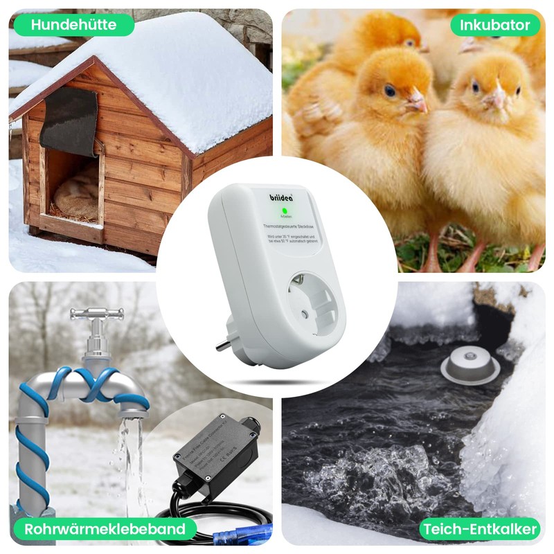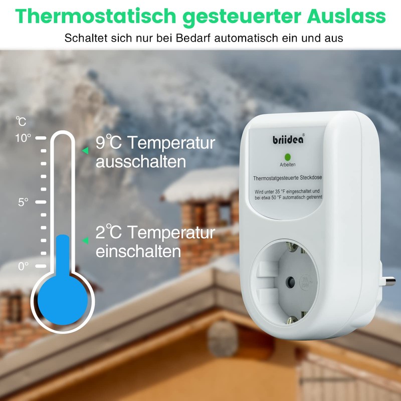 - THERMOSTATIC CONTROL: This thermostat automatically turns on the connected heaters when the outside temperature drops below 2°C, and turns them off when the temperature reaches about 9°C. Perfect solution to the problem of freezing water. So you have a comfortable winter!