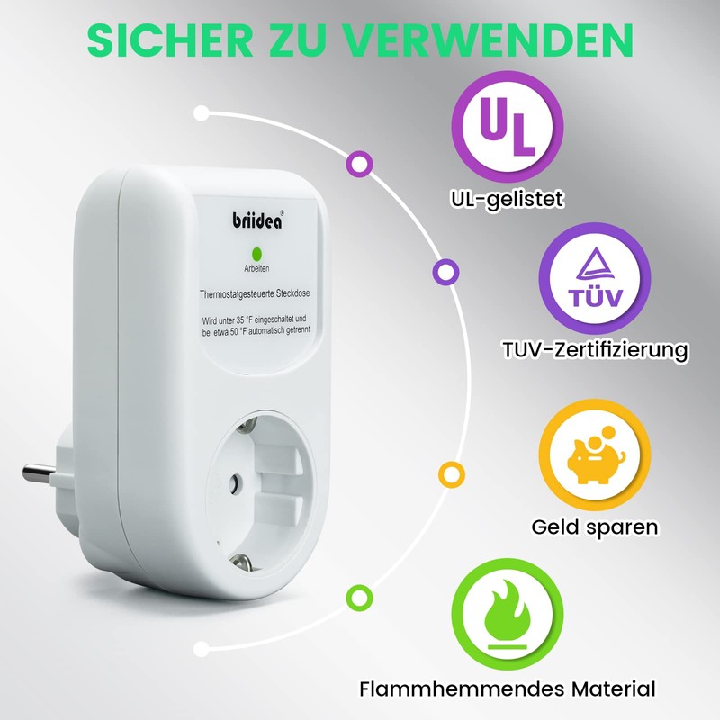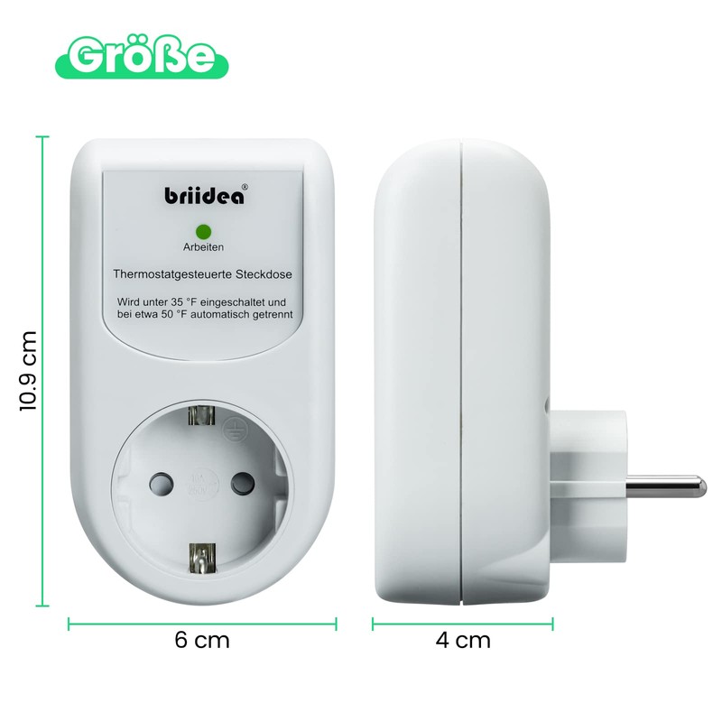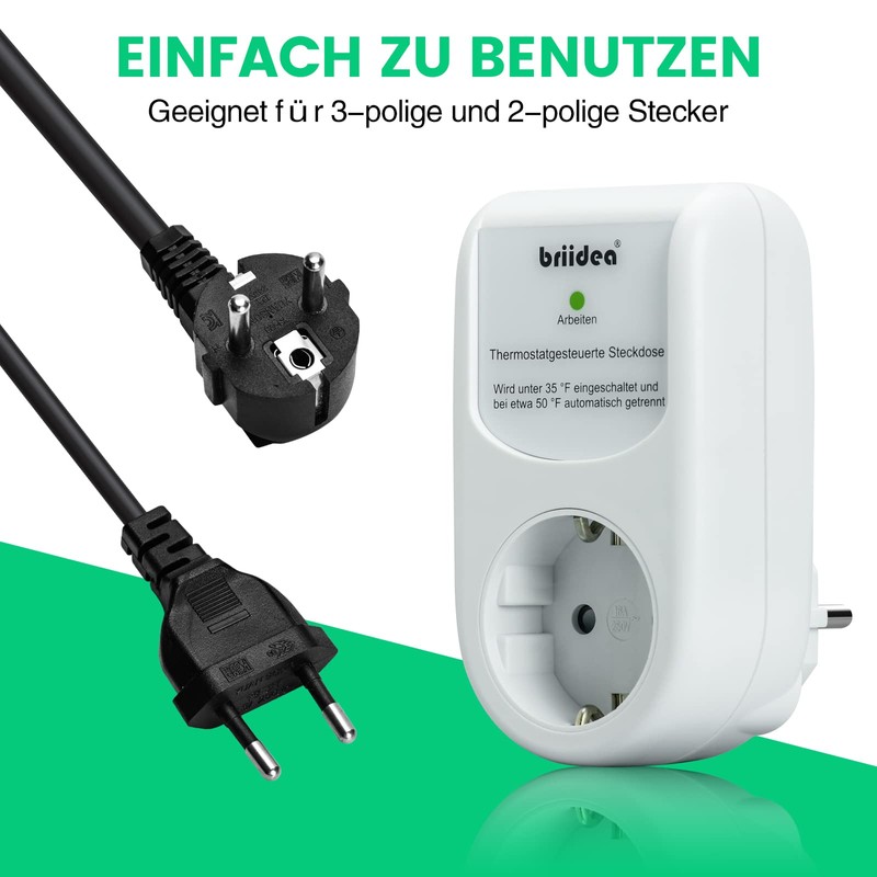 Socket for thermostat control, plug-in frost protection thermostat for pipe heating cables, automatically switches on at 2 °C and off at 9 °C